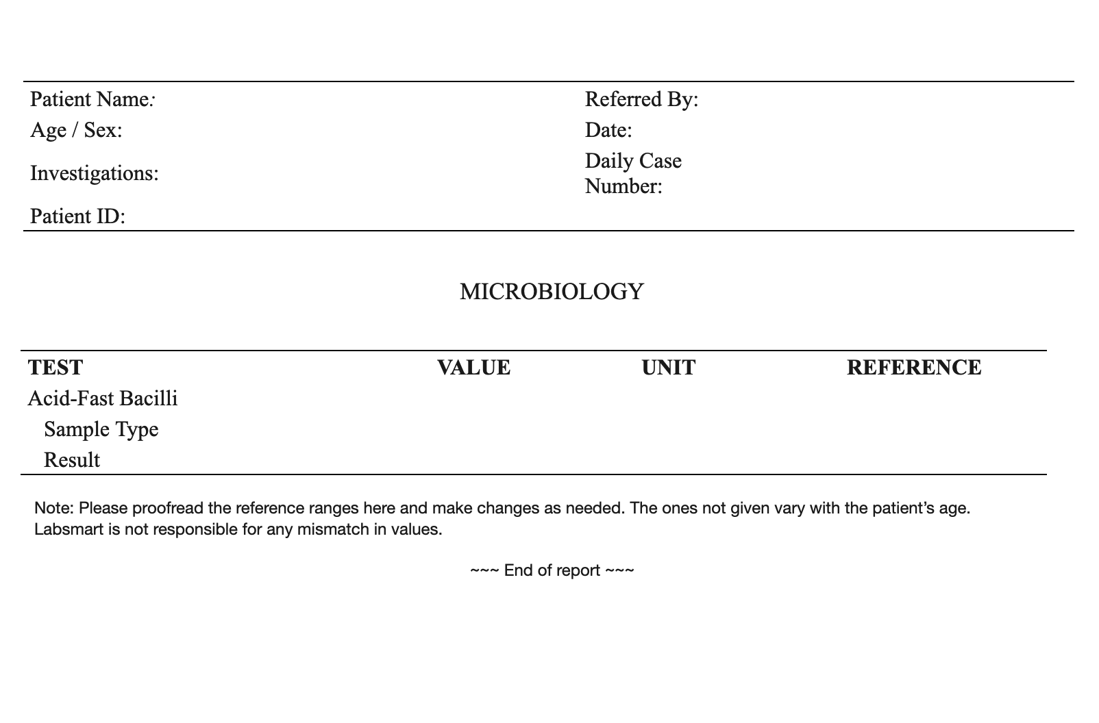 Here’s what an ideal Acid Fast Bacilli report format should include: